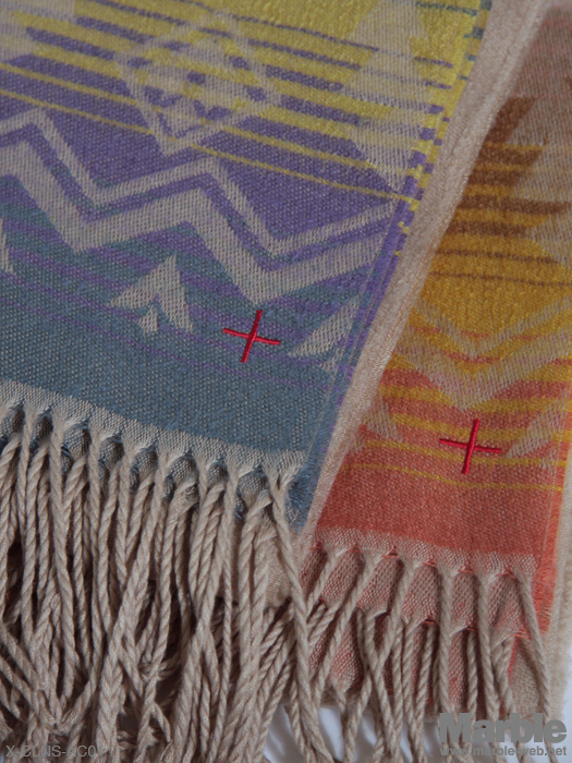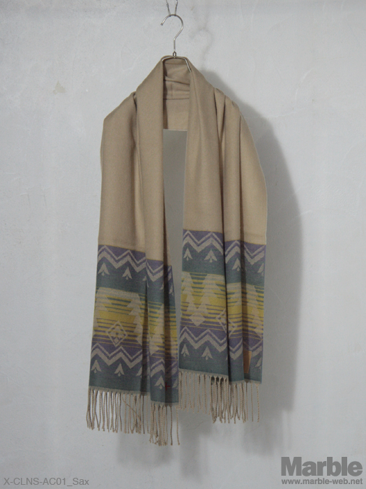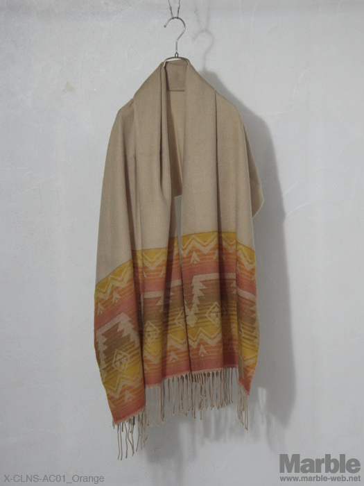 肌触りの良いアクリルを使用したネイティブ柄ストール。大きめなサイズのため多様に使え巻き方一つでいろいろな表情を作ることができ、コーディネイトのポイントに。パラフィン加工帆布とクロスネスのアイコンでもあるクロス刺繍が施されている。