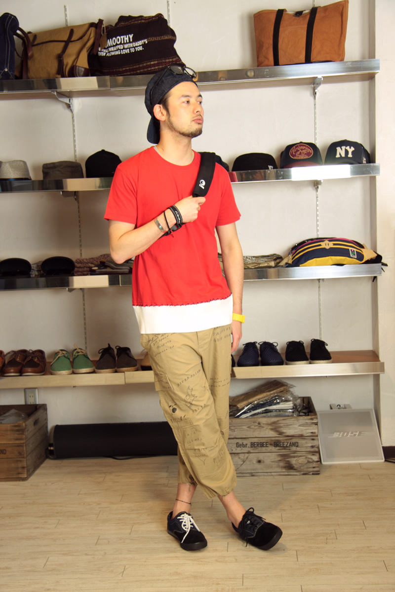 靴の紐や、時計の色とか、キャップなど、ちょっと小物で遊んだ感じです。