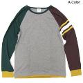 ■身頃部分にダブルフェイスというワッフル生地のような地の目の生地に、袖は20/‐天竺素材(Tシャツ生地)が左右配色になっています。裾のレイヤーと袖口リブもそれぞれ配色になっています。左袖に配色でラインプリントが入ります。