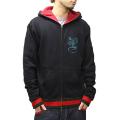 ■起毛した裏毛素材を使用したジップパーカになります。袖口と裾のリブはオリジナルで編み立てたラインのニットリブになります。フード裏は配色のサーマル素材を使用しています。左胸のプリントはフロッキープリントになります。