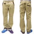 ■T/Cツイル生地を使用したチノパンになります。Wポケット部分と後ろの片玉ポケット口部分にコーデュロイ素材を使用しています。後ろポケットのジップ(テープカラー)を配色にして片玉ポケット下には星の刺繍が入ります。インベル裏と裾裏にレジメン柄の生地が付いているのでロールアップをして柄を見せた着こなしも可能になります。