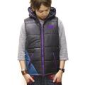 ■ナイロン生地の中綿入りダウンベストパーカーになります。斜めに切り替えた部分とジップカラーが配色になりジップはフードの上まで付きます。裏地はチェック(ブラックウォッチ)のナイロン生地になります。