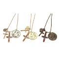 ■ラインストーンのクロストップなどが付いたネックレスです。ラインストーンクロスに加え、プレーンな円柱のクロス、コインに加工を施したニコちゃんコイン、PGオリジナルコインがトップとして付いています。コーディネイトのアクセントやクリスマスプレゼントに最適なアイテムに仕上がっています。