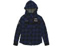 ■ブロックチェックのネル生地を使用したフード付きのシャツになります。マウンテンパーカーのイメージを落とし込んだデザインで洗いをかけてクタッとした風合いに仕上げています。フード裏のネップ生地、コーデュロイ生地での配色、ワッペン、リベット、テープでアクセントをつけたアイテムになります。袖は付属のパーツで7分袖としても使用する事が出来ます。