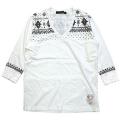 ■コットン100%の30/-のソフト天竺を使用したオリジナルボディの7分袖VネックTシャツです。風合いの良いスプレープリントで民族調の柄と雪柄をミックスしたオリジナル柄をプリントしています。洗い、タンブラー乾燥後にプレスをあえてかけないことで、クタッとした表情に仕上げています。