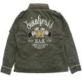 ■高密度のツイル生地を使用したM-65タイプのジャケットです。背中に入る、BARの看板をモチーフにした刺繍がインパクト大です。程良くシェイプしたウエストなど、細身でキレイなシルエットに加えバイオウォッシュを施し、色落ちやアタリ等のUSED感のある雰囲気に仕上がっています。薄手なので春のアウターに最適です。