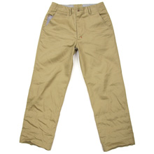 ■CLOSENESS定番の“Steve”をベースにしたワイドなシルエットの“Morgan”。“Steve”とは違い脇をスラックス等に施される割縫いにすることで直線的なシルエットとし、巻縫い仕様の物とは表情が違いやや上品な表情となっています。また、ボタン、リベットを銅色にし、ワイドなシルエットにぴったりな土臭いモノを使用しています。生地は、“Steve”同様のコールドマーセウエポンを使用しハリ、光沢のある独特な雰囲気で、上品な縫い仕様と土臭いディテールを落とし込んだCLOSENESSらしいアイテムに仕上がっています。CLOSENESSのアイコンである股のクロスステッチ、股下のギザステッチが施されています。