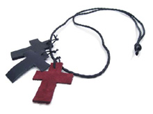 ■3色のレザーを手切りでクロス型に切り抜き、ネックレストップにした手作り感溢れるネックレスになります。革紐部分は簡単にお好みの長さにカットできますので、ブレスレットとしての使用も可能です。