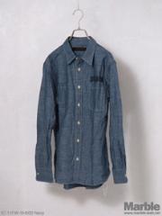 ■製品に経年加工を施したエイジングシャンブレーシャツ。バックにはプリズンパロディー物を再現したステンシルプリントを施している。着込むことで更なる経年変化を楽しめる一枚。