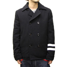 ■定番人気のピーコートになります。今期は袖口上のベルトが無く左袖口上部分に2本のラインプリントが入ります。裏地はナイロンチェック生地の中綿ダイヤキルトになっています。防寒性を高めるため袖口にはリブが付いています。