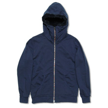 ■フロントにririジップを使用したスウェットパーカー。フード裏にボアを使用している。