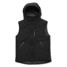 ■60:40クロスを使用した中綿入りの本格仕様のベスト。フロントのririジップやレザーのパイピングがポイント。