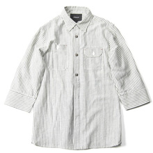 ■ワークテイストが詰まったストライプシャツ。フロントボタンにはUSED加工されたオリジナルコンチョボタンを使用している。