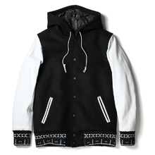 ■リブ部分をオリジナルジャガードで編み立てるなど独自のアプローチで製作したフードスタジャンです。袖にはシープスキンを使用し、より上品な仕上がりとなっています。
