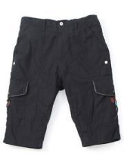 ■5分丈にし、テーパードをきかせることでスッキリとしたシルエットで作られたショーツ。サイドのポケットは革ひもで留められています。
