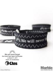 3.11の後、海に沈んだ仲間への哀悼と復興への祈りをこめて腕にウェットスーツの生地で作られた 黒い喪章を装着し日本の各地でサーファーやダイバーによってイベントが開催されていた。営業を再開したモビーディックもこれらの喪章の製作を依頼されていた。その話に感銘を受け、その運動が継続的に沢山の人に伝わらないかと思い完成したのが、このブレス レッドだ。海を愛するサーファーやダイバーの仲間を想う気持ちが広がり3.11の出来事を忘れない 為に・・・。 腕に装着されていた喪章をベースに普段でも着用できるブレスレッドをモビーディックと共同開発 しました。<We Will Never Foeget> 哀悼と復興への祈り。この出来事が語り継がれるように広がれ広がれ。一つ一つにそれぞれ思いを込めて。石巻の工場で被災した職人さん達が力を合わせて作りました。 ウェットスーツに使われる素材を細くひも状に縫い上げ縫い終わりにタグを付けました。 商品にはWe Will Never Foeget<私達は決して忘れないでしょう>の企画コンセプトが入っています。