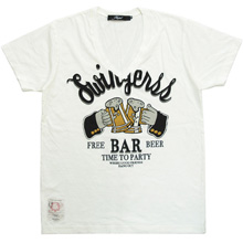 ■コットン100%のソフト天竺生地を使用したオリジナルボディのVネックTシャツです。看板をモチーフにしたプリントが施されています。ワンウォッシュを施しているので風合いのある仕上がりです。