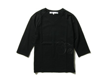 一件シンプルなVネックのカットソーですが、良くみるとラグラン部分と裾にハンドステッチを施していたり、脇から後ろにかけて同色のロゴが入ってます。ハンドステッチはミシンでは出来ないので職人さんが丁寧に仕上げいます。ロゴもラバープリントでさりげなく見えるようにしています。1枚で着た時は、同色のロゴがさりげなく見えます。シャツの中に着た時には、ハンドステッチがさりげなく見えるようにしています。ありそうでなかったVネックのカットソーでシンプルながらも愛着が湧く一枚だと思います。