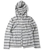 ■カラフルなジャガード生地を使用したフードカーディガン。シンプルなアウターなどに合わせて着たい。