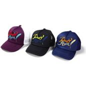 ■フロッキーとシルクプリントを組み合わせたメッシュキャップ。レザーのアジャスターで調整可能。