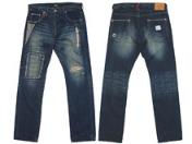 ■13.5ozの赤耳セルビッチ生地を使用したデニムパンツになります。バイオストーンウォッシュ、ピン打ち、ブラスト加工、オーバーダイ、油染み、リペア加工等を施し、USED感のある風合いに仕上げてあります。バックポケット口の赤耳使いや、部分的なウールネップ切り替え、大きめのハトメでアクセントを付けた仕上がりになります。裾を