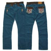 ■定番のコーデュロイパンツです。部分的にピッグスウェードを使用した作りになっています。フロントポケット部分の民族調刺繍やバックポケットのオリジナルの雪柄ニットがアクセントになっています。裾にはグレンチェック生地を張っているので裾を折り返して穿いたり様々な着こなしが楽しめるパンツに仕上がっています。