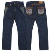 ■13.5ozデニムを使用したワンウォッシュデニムです。部分的にレザーやコーデュロイを使用した作りになっています。フロントポケット部分のウールネップ生地での切り替えやバックポケットのオリジナル雪柄ニットがアクセントになっています。裾にはグレンチェック生地を張っているので裾を折り返して穿いたり様々な着こなしが楽しめるパンツに仕上がっています。