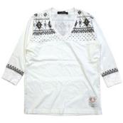■コットン100%の30/-のソフト天竺を使用したオリジナルボディの7分袖VネックTシャツです。風合いの良いスプレープリントで民族調の柄と雪柄をミックスしたオリジナル柄をプリントしています。洗い、タンブラー乾燥後にプレスをあえてかけないことで、クタッとした表情に仕上げています。