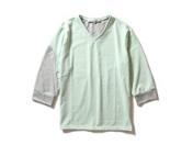 シャツを上に羽織ったときに、レイヤー感が今迄に無い感じになるようなカットソーに仕上げています。ハンドステッチはミシンでは出来ないので職人さんが丁寧に仕上げいます。ありそうでなかった切り替えのこのVネックのカットソーは、重ね着のインナーとしても独特のレイヤー感を出してくれて1枚で着ても独特の切り替え感が良い印象を与えてくれます。