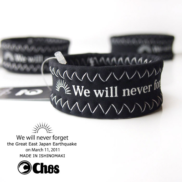 We will never forget<私達は決して忘れないでしょう>の企画コンセプトがプリントされたブレスレット。¥1,100