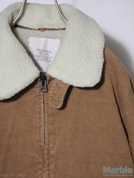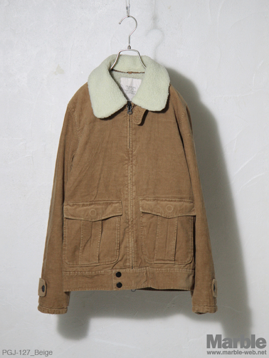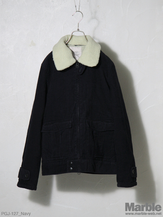 温かみのあるコーデュロイを使用した中綿ブルゾン。襟元に着脱可能なボアを付けボリュームのあるアウターに仕上がっている。裏地はキルティング仕様で保温性の高いアイテムとなっている。