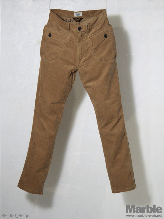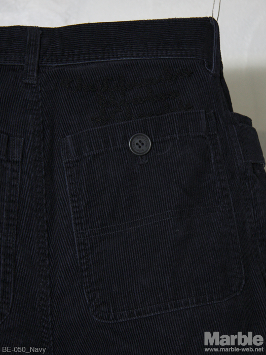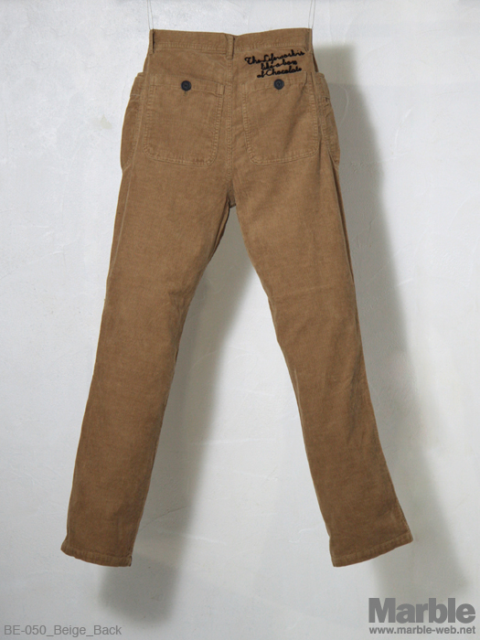 温かみのあるコーデュロイパンツ。ポケットの形状が特徴的なこのコーデュロイパンツ。ポケットの裏地には柄生地を配し見えないところにも手が入っている仕上がり。バックポケット部分のチェーンステッチ刺繍がポイント。