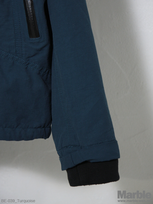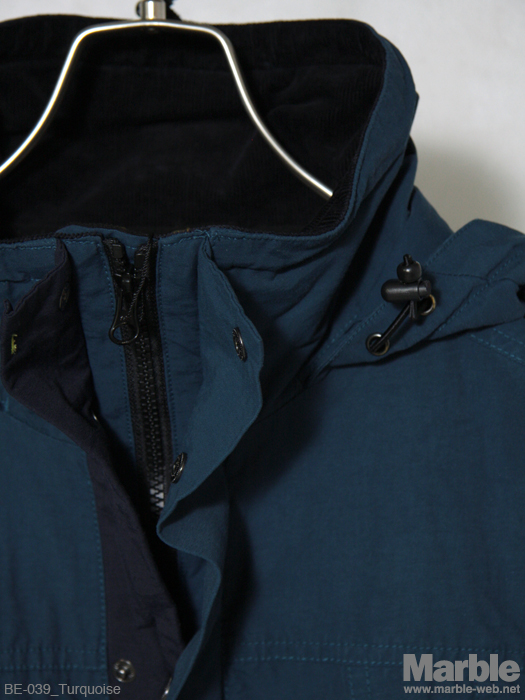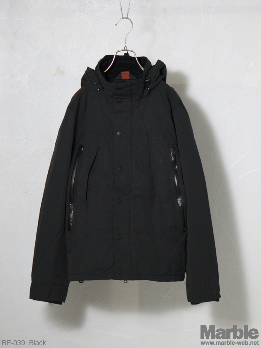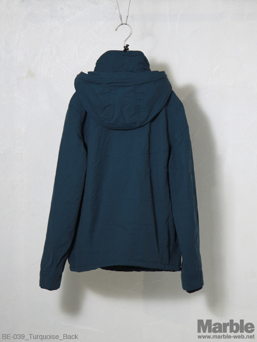 60/40生地を使ったフードブルゾン。フードは収納可能で2パターンで楽しめる。止水ジップやカフスリブなどしっかりと作り込まれている。前立ての2重構造に加え裏地にはフリース生地を施し防寒性の高いアウターに仕上がってる。冬到来前には用意しておきたい一着。
