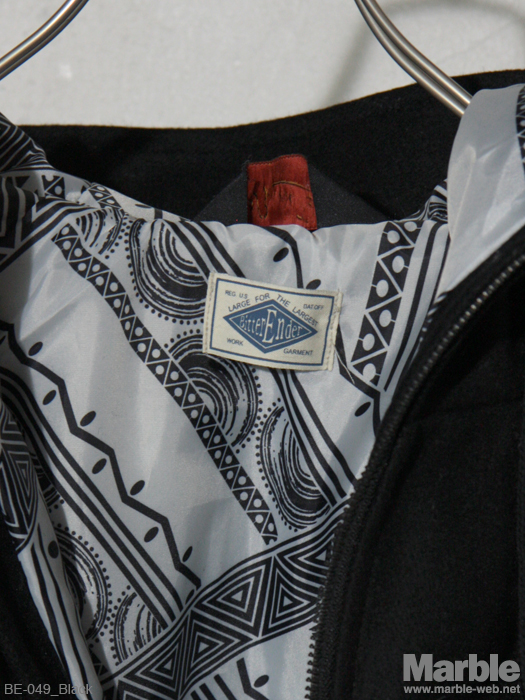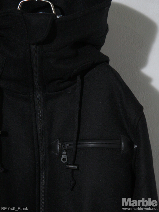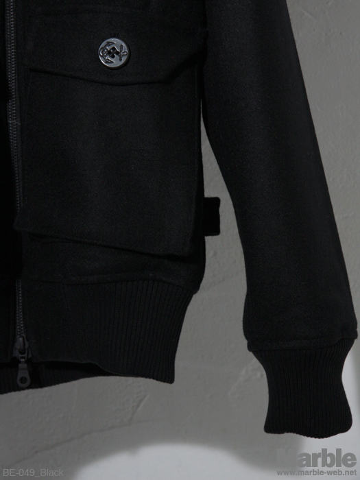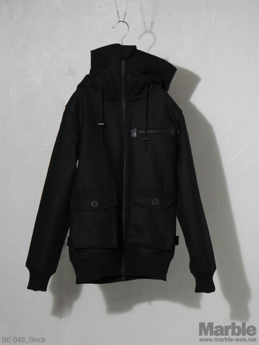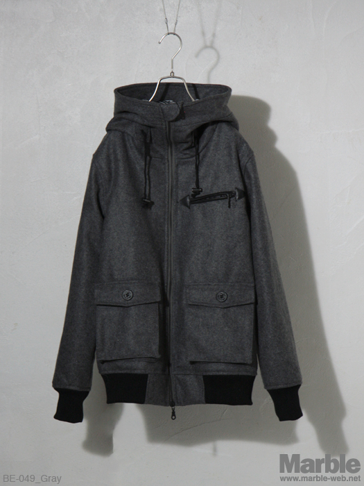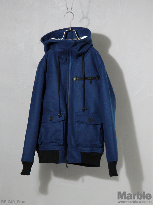 大きなフードが特徴的なメルトンブルゾン。シンプルなデザインながらそのフードがインパクトある仕上がり。ダブルスライダーで様々な着こなしが出来る万能アウター。柄の裏地もポイント。
