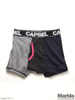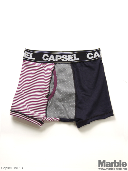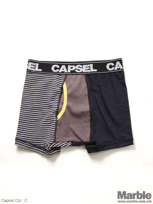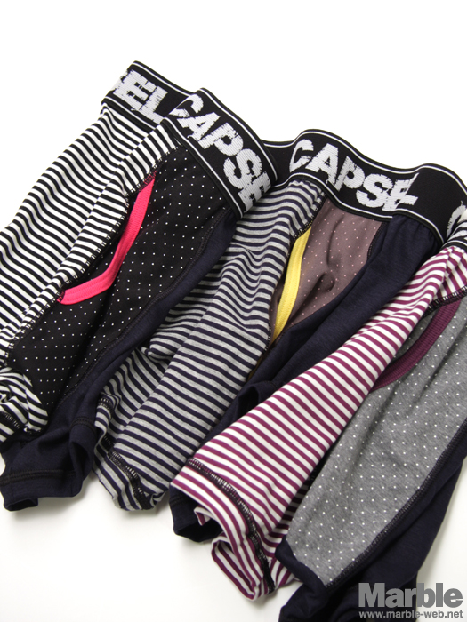 CAPSELからメンズアンダーウエアが入荷です。衣類の中で一番接する時間が長いアンダーウエア。CAPSELは、そんなアイテムだからこそ、品質、デザイン、そして価格にこだわりを持って生産されています。毎日身につける物だから価格はリーズナブルでも人と同じモノが嫌な方オススメです!ボトムスを腰で穿いた時に時折覗く、CAPSELのロゴとポップなデザインは高い満足感を与えてくれます。伸縮性のある素材を使っているためしっかりとフィットします。プレゼントとしても最適です。