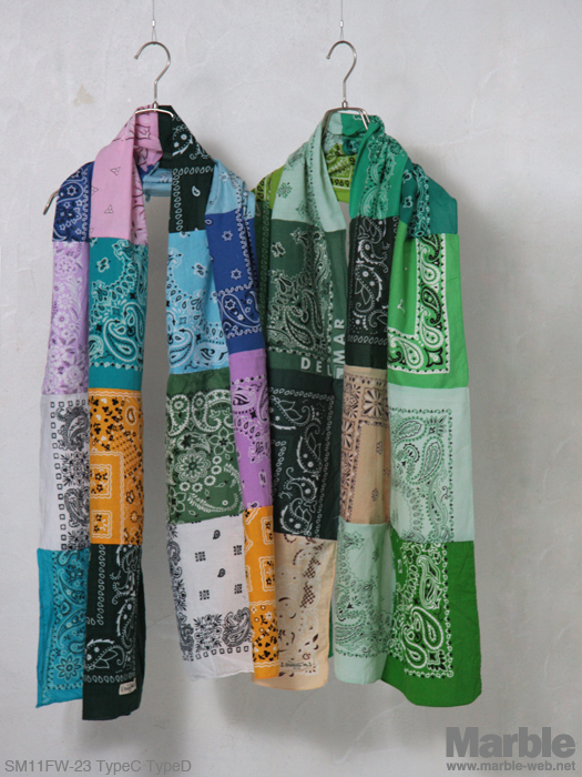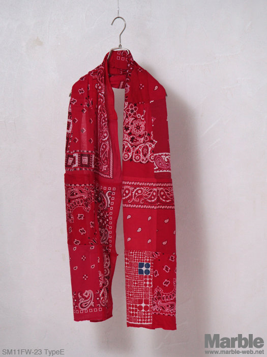 Made in USAのユーズドバンダナを縫い合わせ形成したストール。一点一点異なる配色でONE & ONLYなアイテム。コーディネイトのポイントとして活躍してくれる。