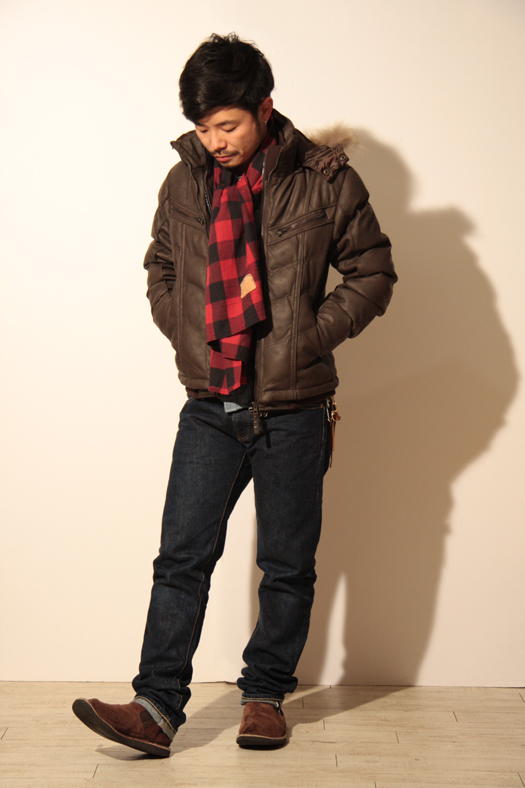 トップス、パンツをベーシックに小物で色を入れたコーディネイト。シンプルなコーディネイトにブロックチェックのストールで遊びを入れてみました。PROGRAMのジャケットはLサイズを着ていますがタイトなサイズ感ですので、僕の体型でもダボッとしなくスッキリと着こなせます。細身のデニムパンツともサイズ感良しだと思います。